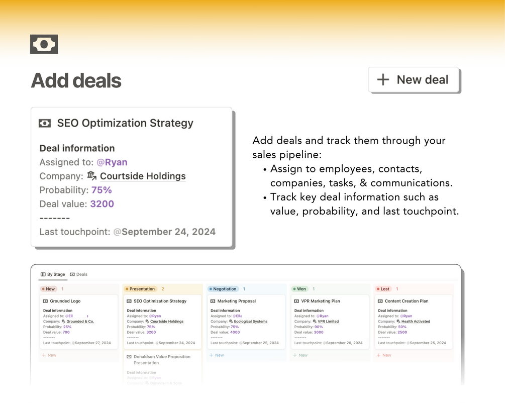 Add deals: Quickly add deals you're working on and track them through your sales pipeline. Monitor the last touchpoint to remain in contact for higher conversion.