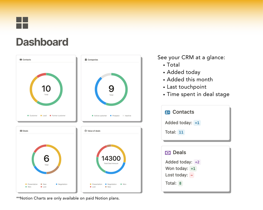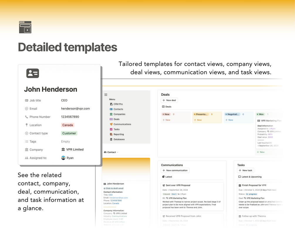 Template for freelancers tracking their clients and deals. Perfect customer relationship management (CRM) tool for tracking clients, companies, deals, communications, and tasks with built in reporting features.
