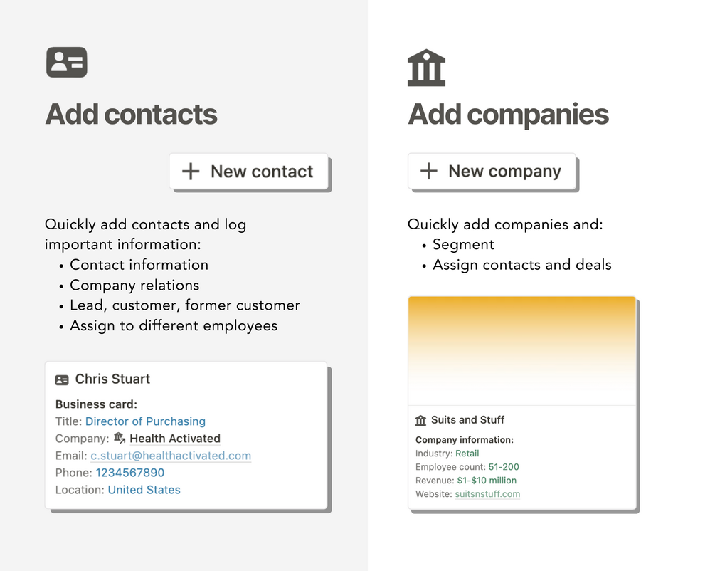 Add contacts and companies: Quickly add contacts, companies, and related information. Segment and categorize to stay organized and efficient.