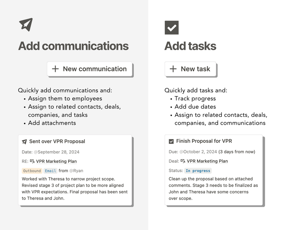 Add communications and tasks: Track client touch points and associated tasks to stay on top of your customer relationships. Add documents and attachments.